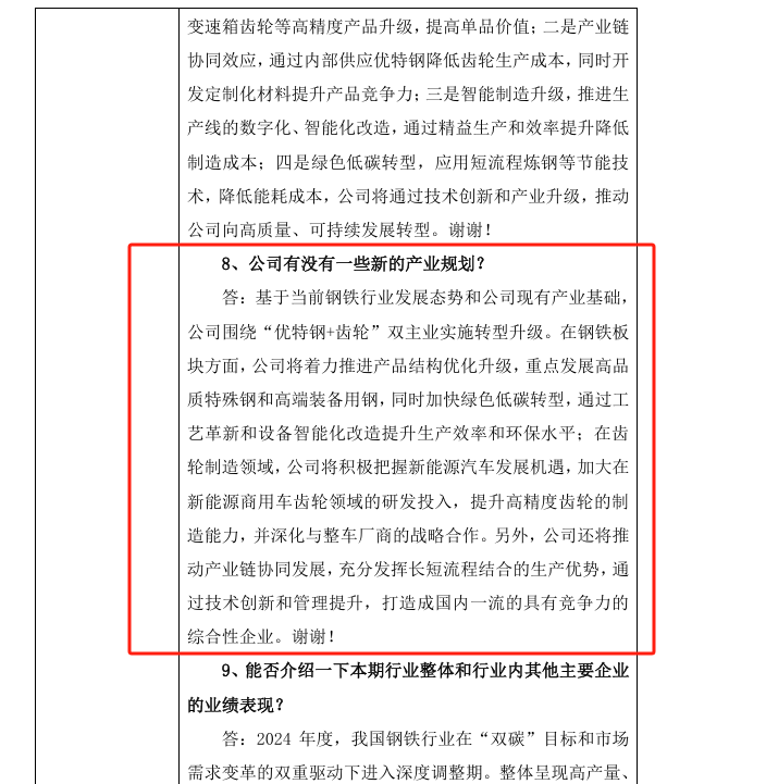 基于當(dāng)前鋼鐵行業(yè)發(fā)展態(tài)勢和公司現(xiàn)有產(chǎn)業(yè)基礎(chǔ),公司圍繞“優(yōu)特鋼+齒輪”雙主業(yè)實施轉(zhuǎn)型升級。在鋼鐵板塊方面,公司將著力推進產(chǎn)品結(jié)構(gòu)優(yōu)化升級,重點發(fā)展高品質(zhì)特殊鋼和高端裝備用鋼,同時加快綠色低碳轉(zhuǎn)型,通過工藝革新和設(shè)備智能化改造提升生產(chǎn)效率和環(huán)保水平;在齒輪制造領(lǐng)域,公司將積極把握新能源汽車發(fā)展機遇,加大在新能源商用車齒輪領(lǐng)域的研發(fā)投入,提升高精度齒輪的制造能力,并深化與整車廠商的戰(zhàn)略合作。另外,公司還將推動產(chǎn)業(yè)鏈協(xié)同發(fā)展,充分發(fā)揮長短流程結(jié)合的生產(chǎn)優(yōu)勢,通過技術(shù)創(chuàng)新和管理提升,打造成國內(nèi)一流的具有競爭力的綜合性企業(yè)。