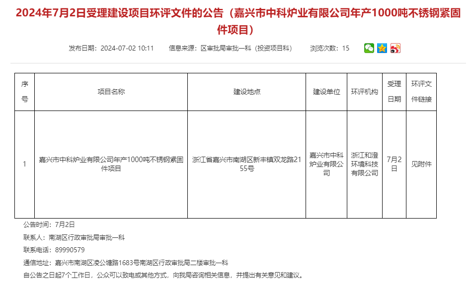 嘉興市中科爐業(yè)有限公司年產(chǎn)1000噸不銹鋼緊固件項(xiàng)目環(huán)評獲受理
